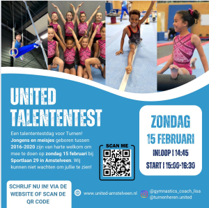 Bij United Amstelveen staat plezier in de gymsport voorop. Voor jong en oud, recreant en topsporter (in spe). Je kunt bij ons recreatief sporten maar we schitteren ook op regionale en landelijke wedstrijdvloeren. Zoek je (voor je kind) een leuke sport? Wil je bij een vereniging die een gezellige sfeer combineert met ambitie, gedrevenheid en geweldige trainers? Dan is United jouw club. Kom je bij ons sporten?